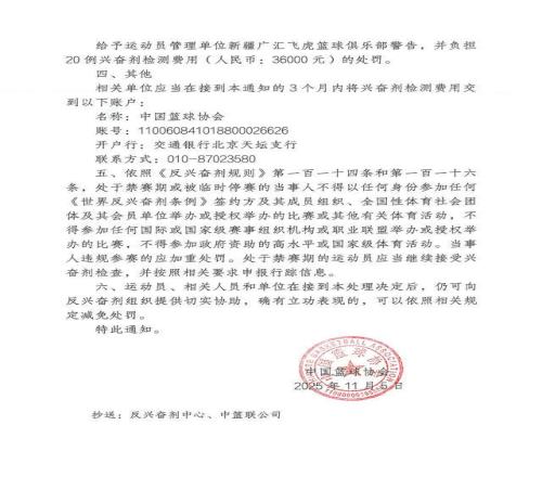 北京时间今日,中国篮协官方发布公告,上赛季效力于新疆男篮的外援蒙特雷兹-哈雷尔因兴奋剂违规被禁赛3个月,期限为2025年11月5日到2026年2月4日,新疆男篮则承担20例兴奋剂检测的费用共36000元。