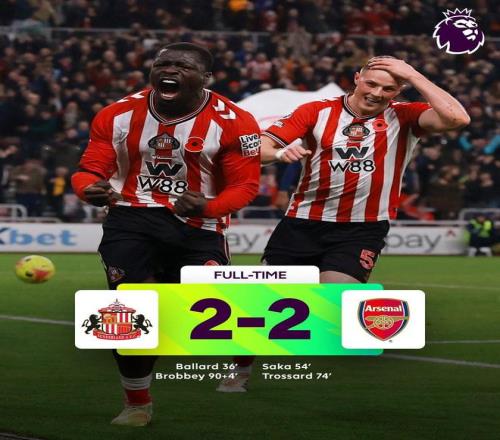 英超第11轮,阿森纳客场2-2战平桑德兰,这是阿森纳自去年9月2-2战平曼城以来首次在英超被对手第90分钟后绝平。
