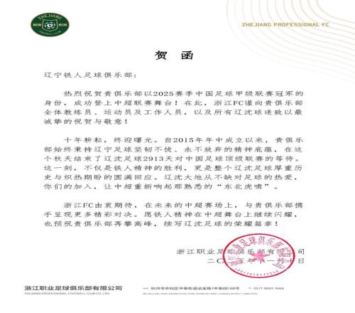 北京时间11月10日,浙江职业足球俱乐部官方发布贺函,祝贺重庆铜梁龙与辽宁铁人成功冲超。