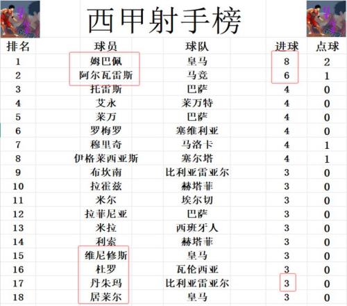 射手榜方面,姆巴佩8球领跑,阿尔瓦雷斯6球位列第2,托雷斯,莱万,穆里奇,伊格莱西亚斯等人4球槟榔第3。丹朱玛破门,失点无缘双响,他就只能追上维尼修斯,拉菲尼亚等人3球刚好挤入前十。