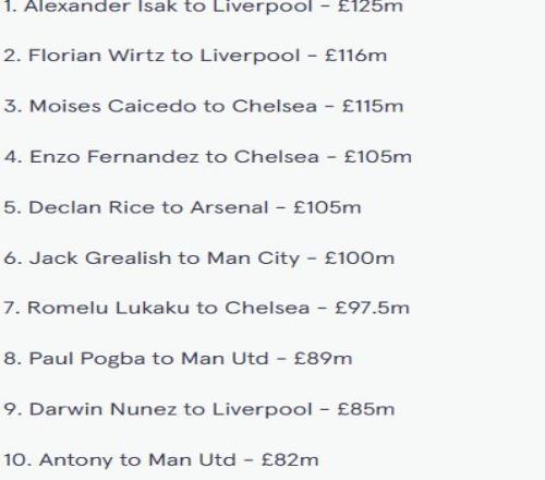 英超历史最贵引援榜单(前十)