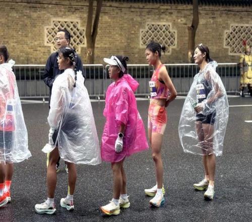精英热身区里,朱卿、黄菲、潘素芳、李春霞等十位特邀精英穿着羽绒服,来回折返做着赛前的热身跑以及动态的热身训练。存衣完毕后,她们换上背心短裤披上雨衣,在等待身份检验的间隙不断活动着身体以保证刚热身开的肌肉保持弹性。