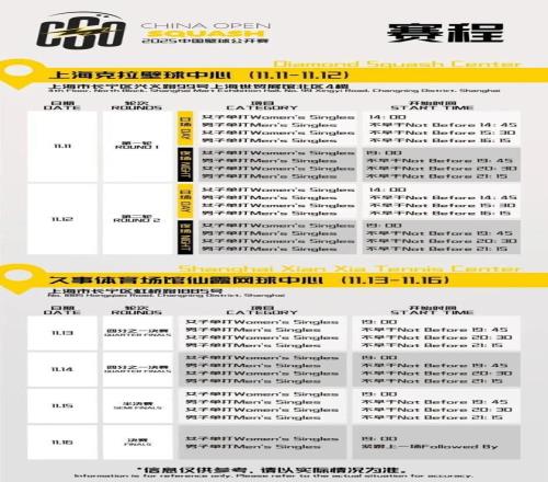 本届比赛的赛程延长至6天,首次采用“双主场”模式。11月11日至12日的前两轮比赛将在上海克拉壁球中心展开,11月13日的四分之一比赛开始,赛事将来到久负盛名的久事体育场馆仙霞网球中心,以不同场馆的展示特性,来打造多层次、全景式观赛体验。赛事票务销售已于10月17日中午12时正式启动。