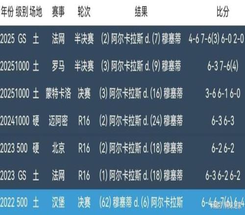 阿尔卡拉斯当然有理由兴奋,毕竟他和穆塞蒂两人职业生涯至今交锋七次,六胜一负遥遥领先。2022年ATP250乌玛格站决赛,阿尔卡拉斯三盘不敌穆塞蒂,输掉了两人职业生涯首次交锋。此后六次交锋,包括四次红土、两次硬地交锋,阿尔卡拉斯全部战胜对手,其中今年就是三次红土交锋。