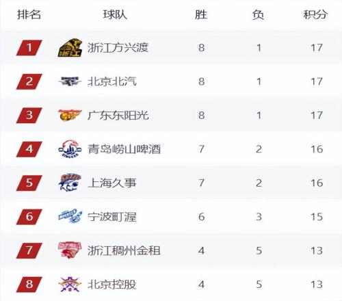 CBA第9轮7场大战后,最新的积分榜暂时如下:随着广东不敌北京让出榜首后,目前前四积分榜上再次迎来变动,广厦北京双双大胜,广东北京广厦目前战绩都来到了8胜1负,广厦7连胜并且上一轮击败北京,以交手战绩优势和净胜分优势跻身榜首,北京来到第2,广东下滑来到第3;