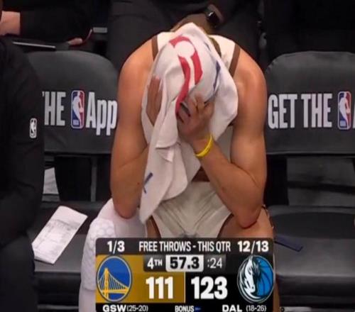 末节垃圾时间,坐在替补席的库里先是眼神空洞望着已经失去悬念的记分牌,接着用毛巾将头捂了起来,无奈之情溢于言表。