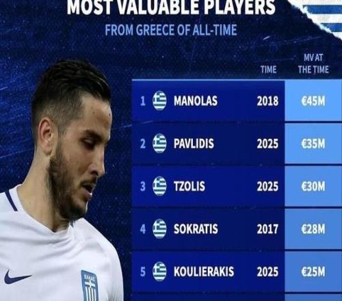 北京时间11月16日,德转列出了希腊历史身价排名前10的球员,2018年身价曾经达到4500万欧元的马诺拉斯高居第一,本菲卡前锋帕夫利季斯3500万欧元第二,利物浦的旧将齐米卡斯排在第十