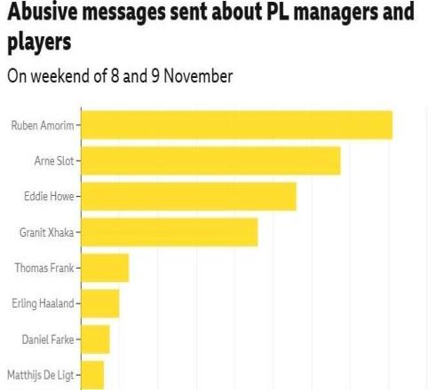 英媒调查:英超第11轮期间阿莫林、斯洛特遭最多网络攻击